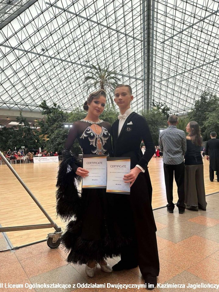 W minioną niedzielę 23.02.2025 Krzysztof Szostak z klasy 1d wraz z partnerką zajęli na Międzynarodowym Turnieju Tańca Towarzyskiego Pyramid Cup w Vösendorfie (Austria) IV miejsce w stylu standardowym pokonując 20 par z 10 państw.