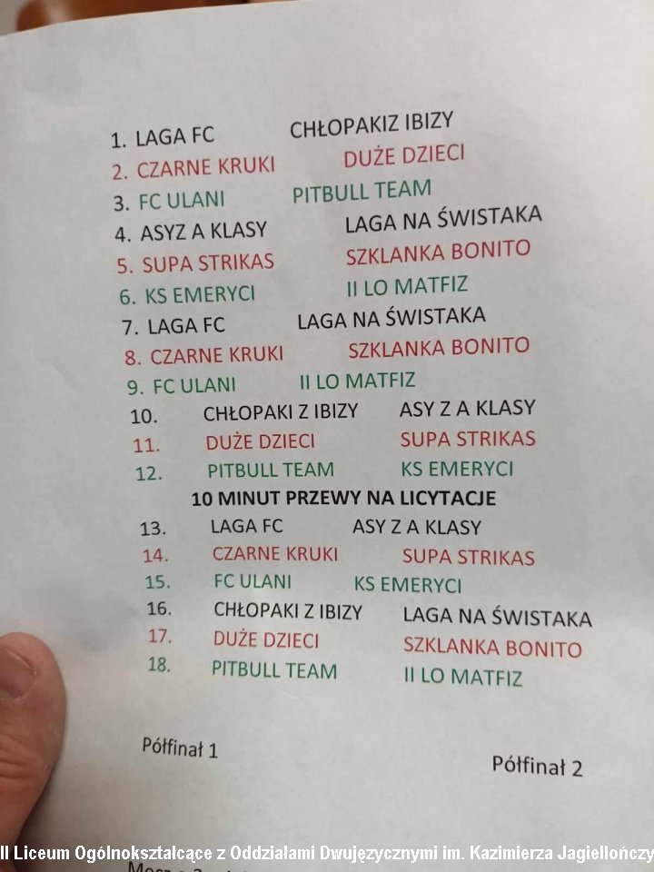 Ten zespół awansował do półfinału. Niestety po regulaminowym czasie gry ulegli w rzutach karnych. W grze o trzecie miejsce również w regulaminowym czasie był remis i po serii rzutów karnych przegrali z zespołem z IV LO i zajęli czwarte miejsce.